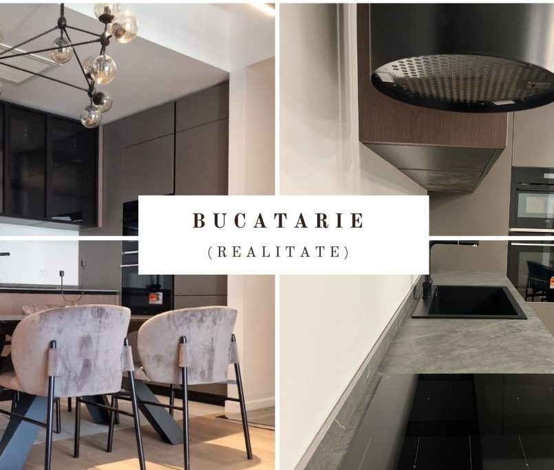 - Bucatarie open-space cu texturi naturale si detalii minimaliste