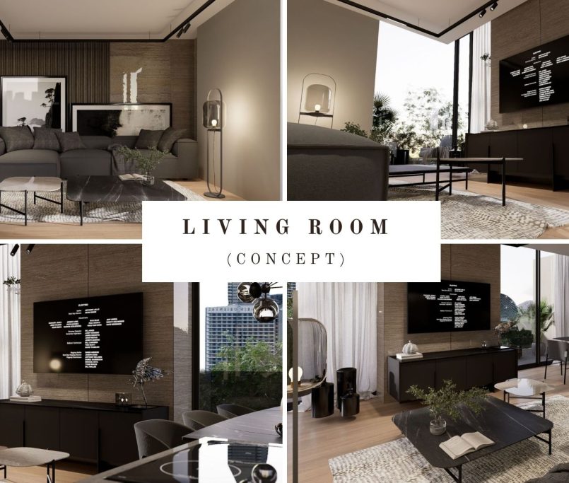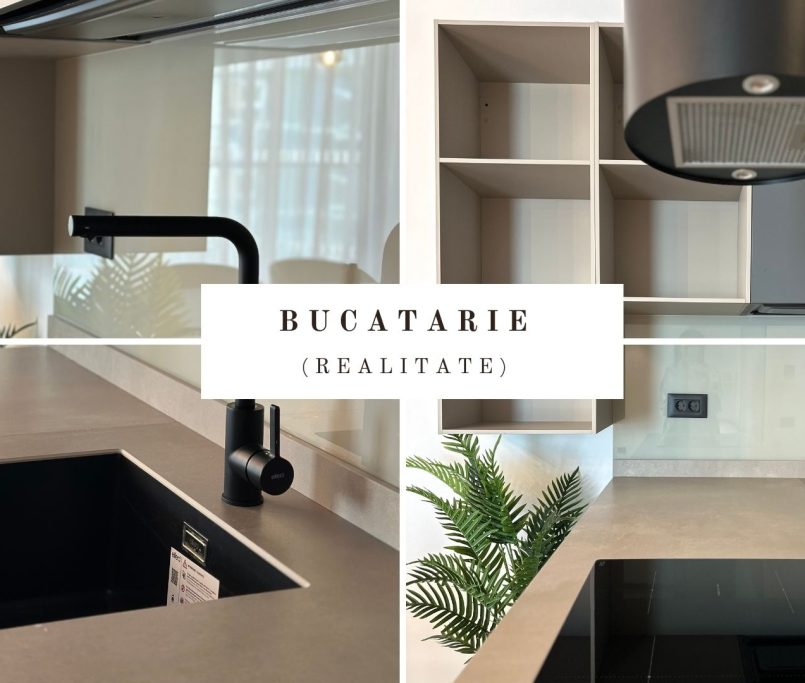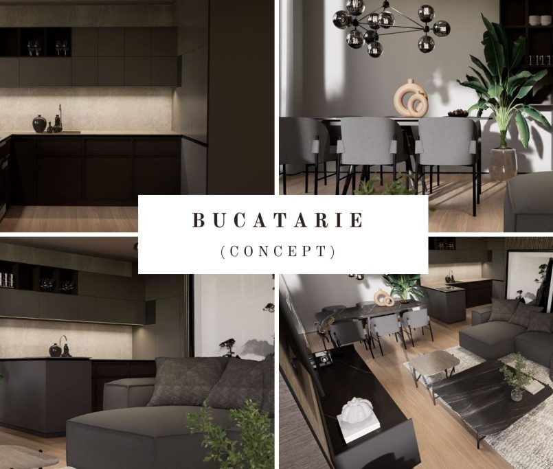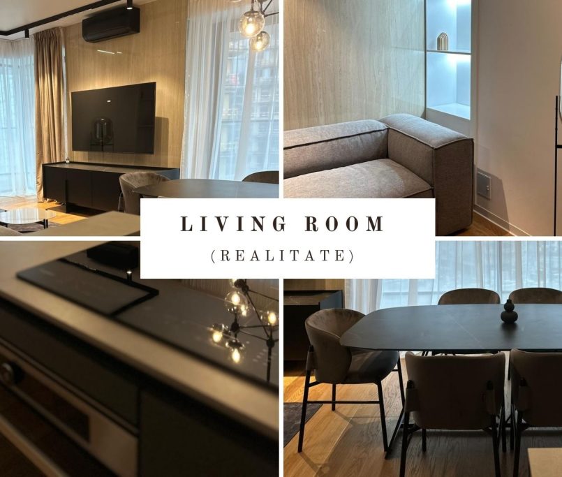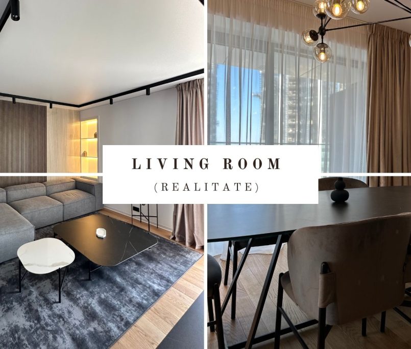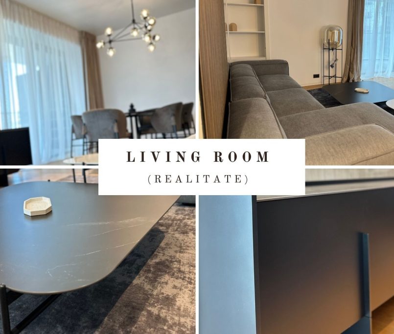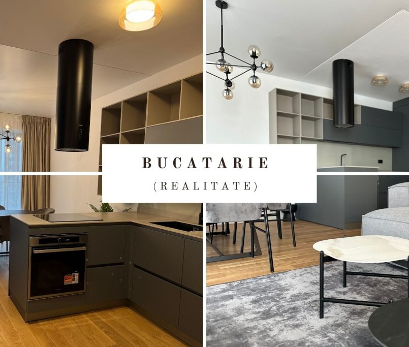 Designul apartamentului de 3 camere este coerent, rafinat si construit in jurul unui concept modern, cu accente naturale si volumetrii echilibrate. Amenajarea imbina linii clare, materiale premium si o paleta cromatica sobra, dominata de griuri calde, negru mat si insertii de lemn natural.
