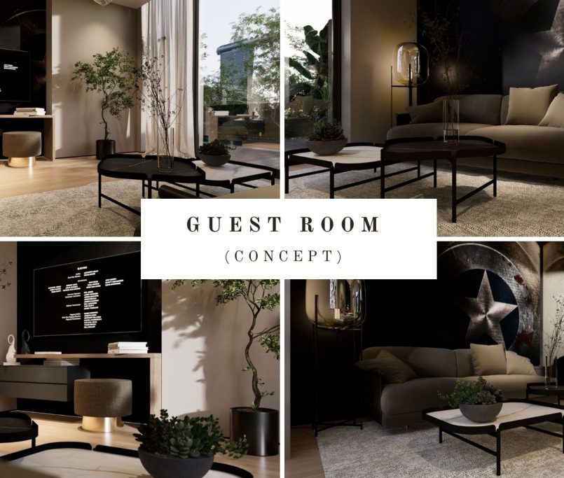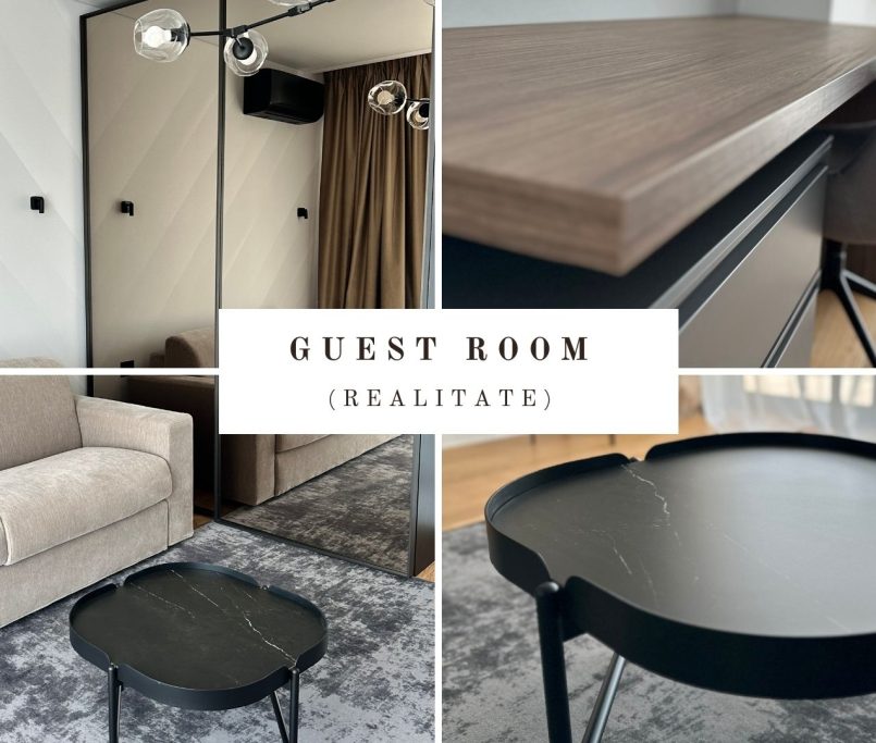 Camera de oaspeti pastreaza aceeasi coerenta stilistica, cu mobilier esential, canapea extensibila si birou integrat. Tonurile neutre si texturile mate pastreaza senzatia de continuitate si calm.