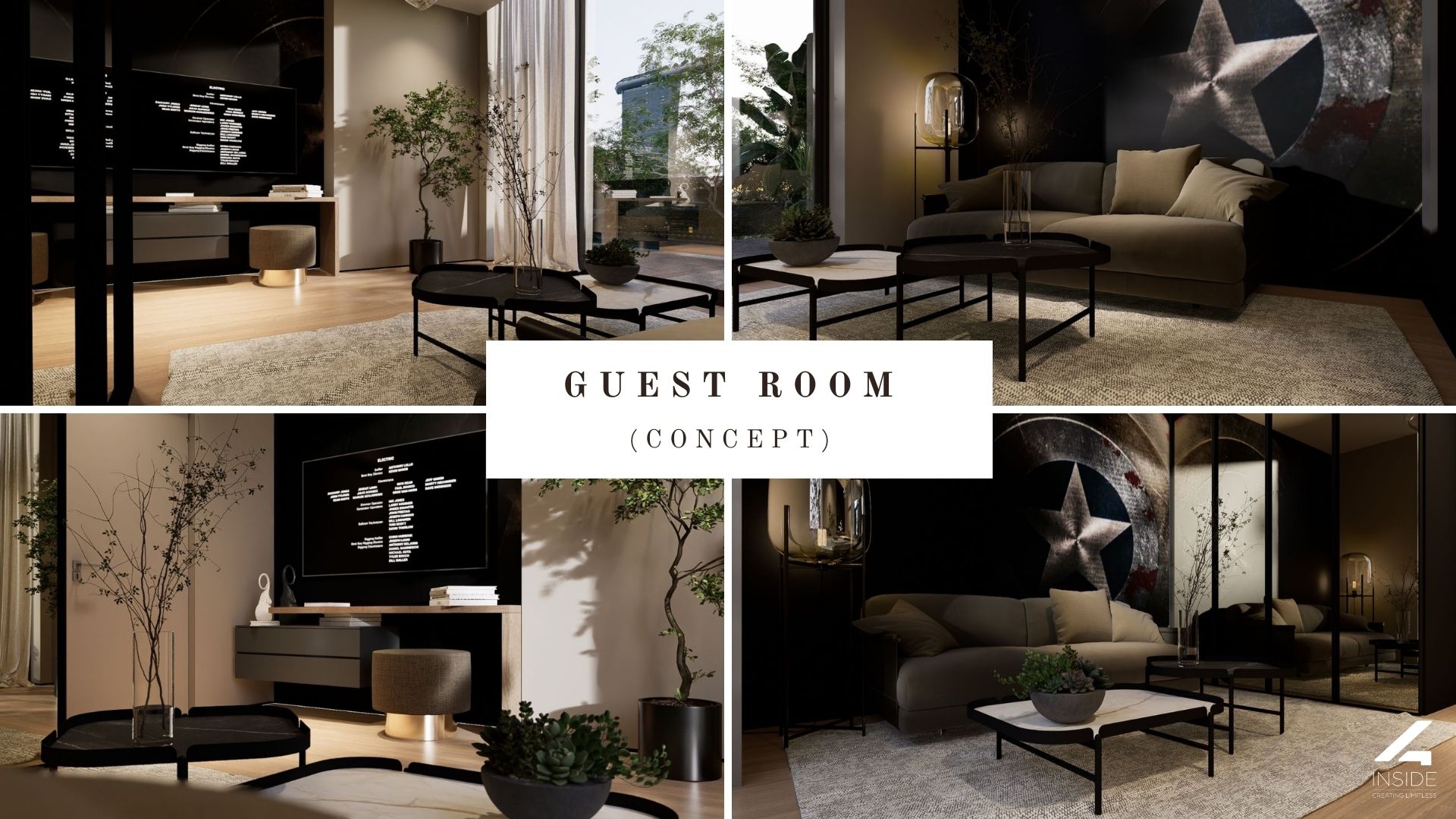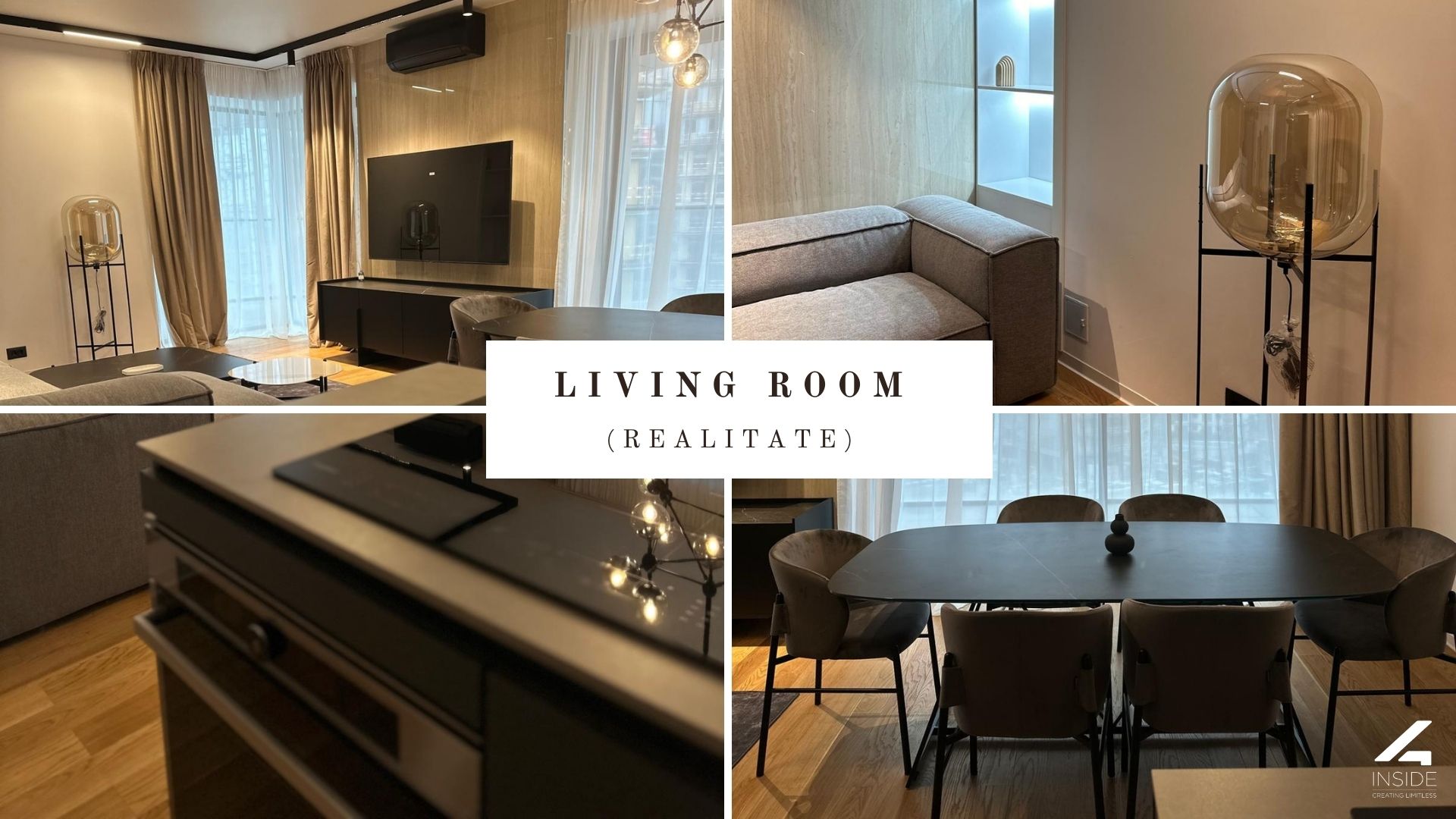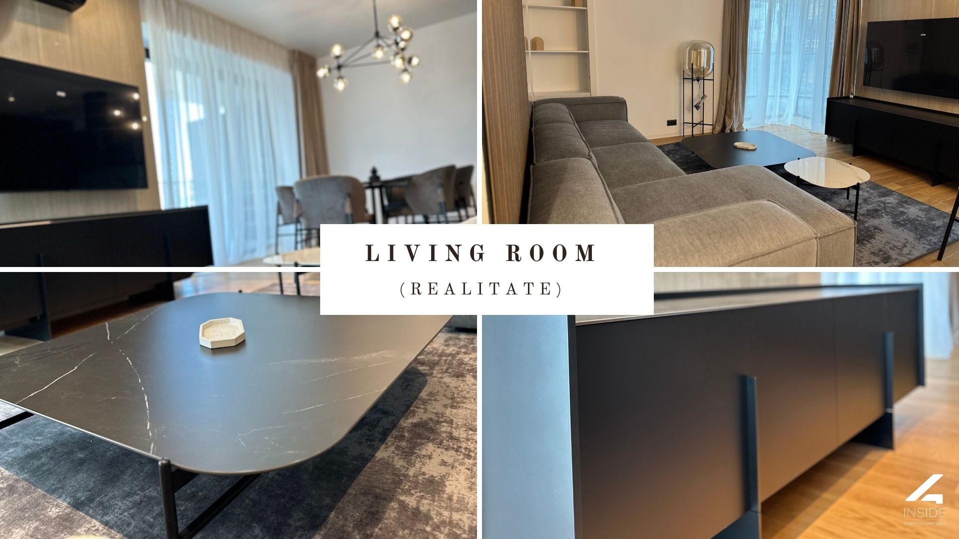 Livingul este spatios si bine compartimentat, cu o canapea modulara generoasa, completata de masute cu blaturi contrastante si structuri metalice fine. Zona TV include o comoda cu design minimalist si perete decorativ cu textura naturala, care adauga profunzime vizuala spatiului. Decorul este completat de lumina ambientala bine calculata si corpuri de iluminat statement.