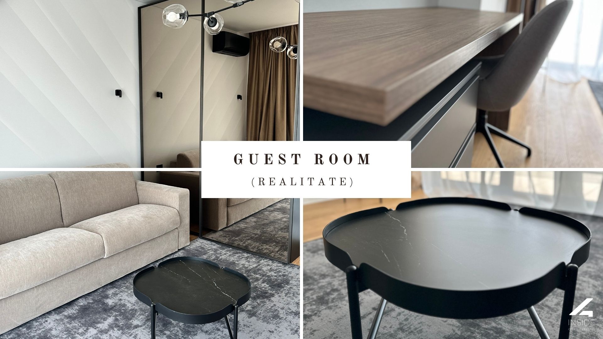Camera de oaspeti pastreaza aceeasi coerenta stilistica, cu mobilier esential, canapea extensibila si birou integrat. Tonurile neutre si texturile mate pastreaza senzatia de continuitate si calm.