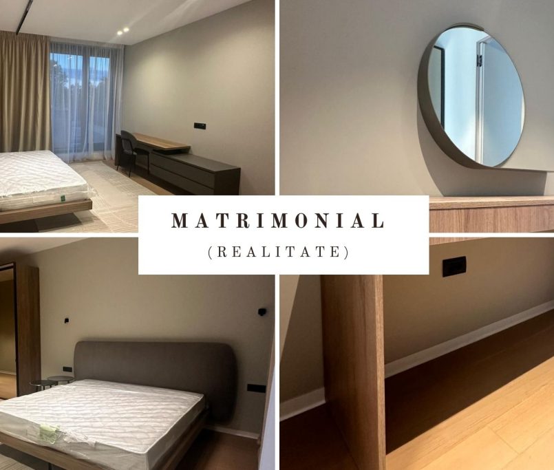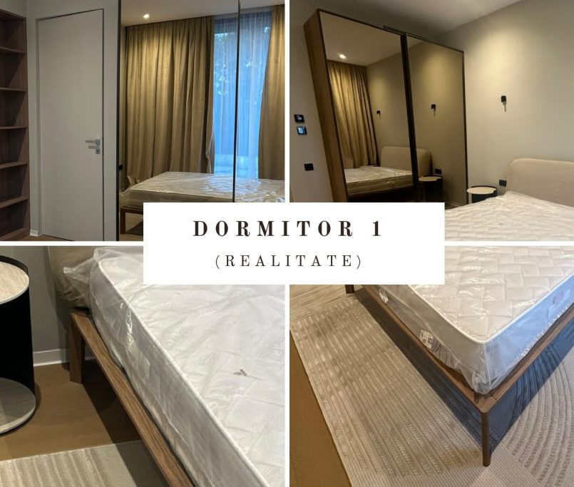 Dormitorul matrimonial este sofisticat si odihnitor, cu un pat impunator, tuse de catifea si lumini calde. Oglinzile, tapetul decorativ si noptierele compacte contureaza o atmosfera intima si moderna, perfecta pentru relaxare.