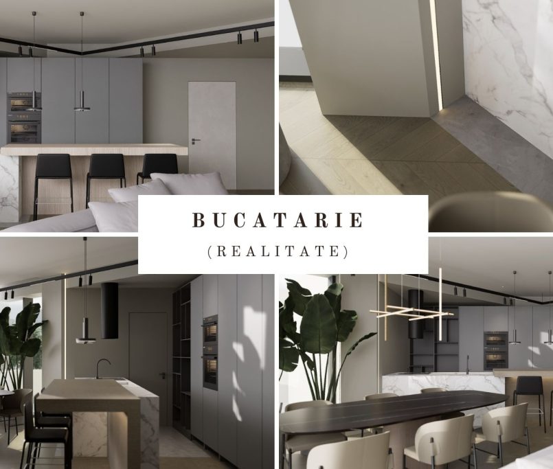 Bucataria este definita de linii drepte si fronturi mate, fara manere vizibile, intr-o compozitie deschisa si functionala. Modulul insular creeaza o separare subtila intre zona de gatit si restul livingului, adaugand si un spatiu de lucru suplimentar.