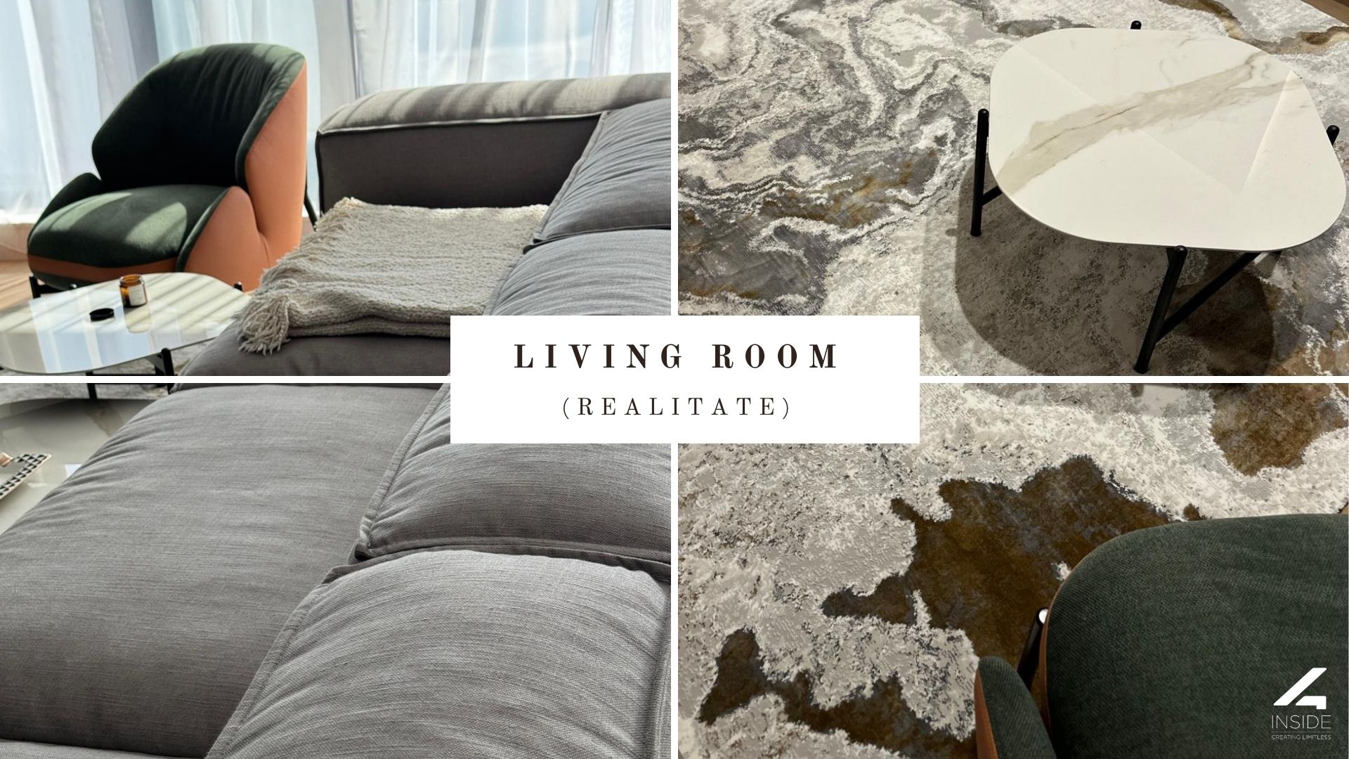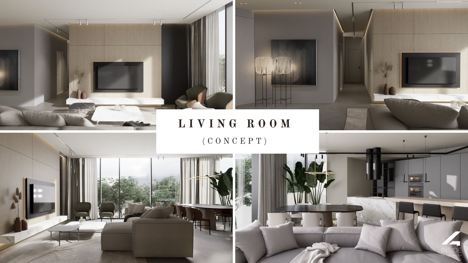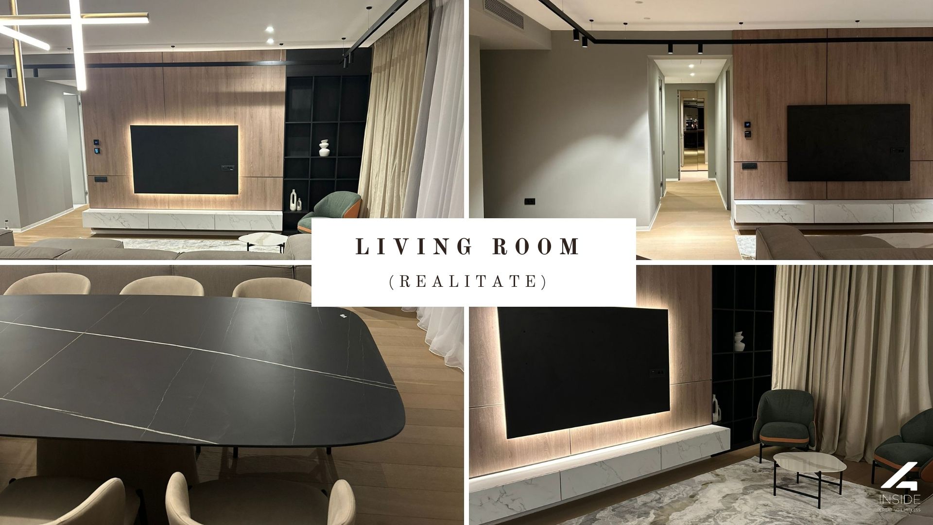 Livingul este spatios si bine compartimentat, cu o canapea modulara generoasa, completata de masute cu blaturi contrastante si structuri metalice fine. Zona TV include o comoda cu design minimalist si perete decorativ cu textura naturala, care adauga profunzime vizuala spatiului. Decorul este completat de lumina ambientala bine calculata si corpuri de iluminat statement.
