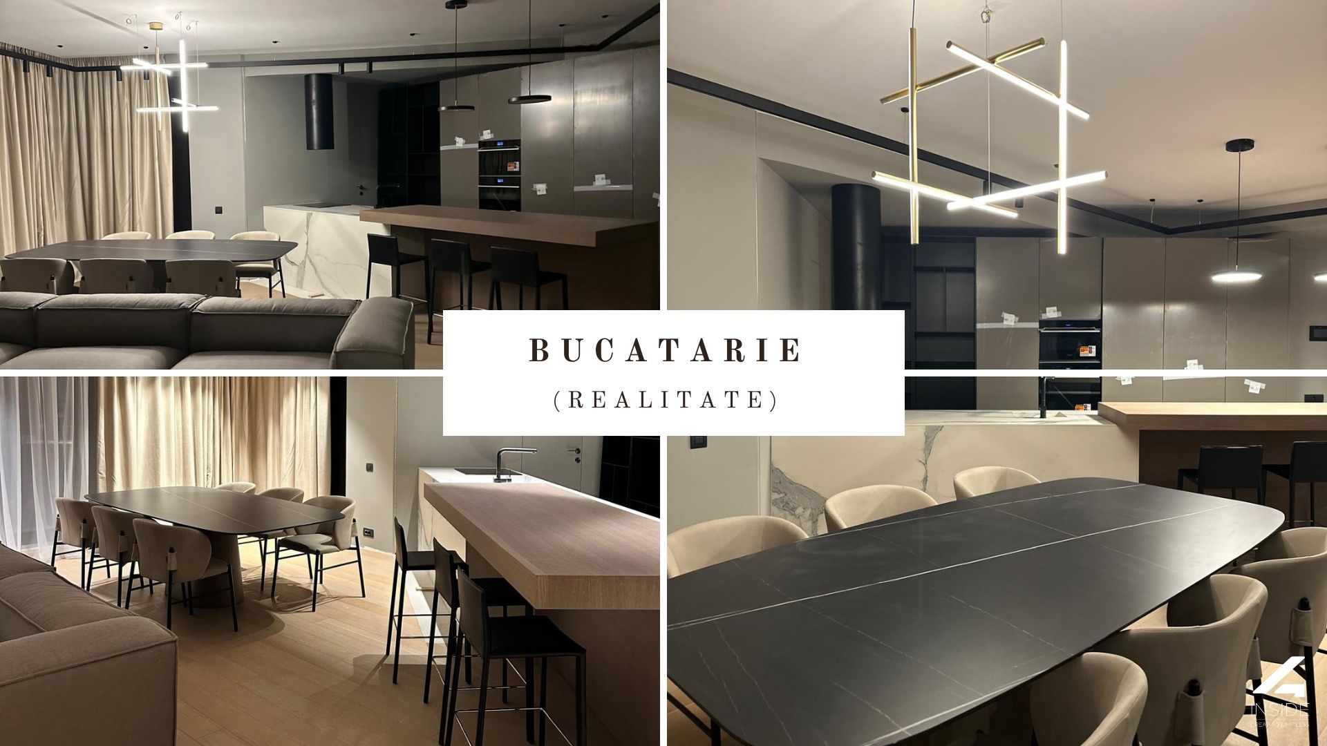 Bucataria este definita de linii drepte si fronturi mate, fara manere vizibile, intr-o compozitie deschisa si functionala. Modulul insular creeaza o separare subtila intre zona de gatit si restul livingului, adaugand si un spatiu de lucru suplimentar.